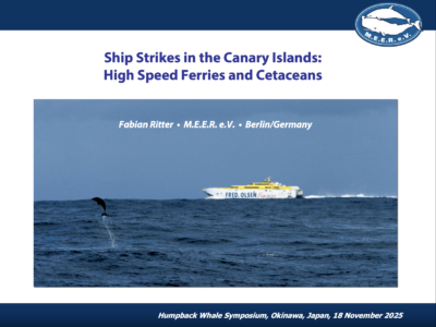 Am 18. November 2025 fand in Okinawa (Japan) ein Symposium statt, das auf die Thematik der Kollisionen von Schiffen mit Walen fokussierte. In Okinawa, einer Inselgruppe südlich von Japan, ist geplant, eine Tragflächenboot-Verbindung zwischen verschiedenen Häfen einzurichten, die jedoch direkt durch wichtige Lebensräume der lokalen Buckelwalpopulation führen würde. Hierüber regte sich in den letzten Monaten Protest, an dem sich M.E.E.R. in Kooperation mit WDC Deutschland beteiligte. Während des Symposium, bei dem sich die verscheinden Stakholder (inklusive Fährbetreiber und Whale Watching-Vereinigungen, sowie Wissenschaftler begegneten) trat Fabian Ritter von M.E.E.R. als Gastredner auf und schilderte mit seiner Präsentation die Situation auf den... Continue Reading
